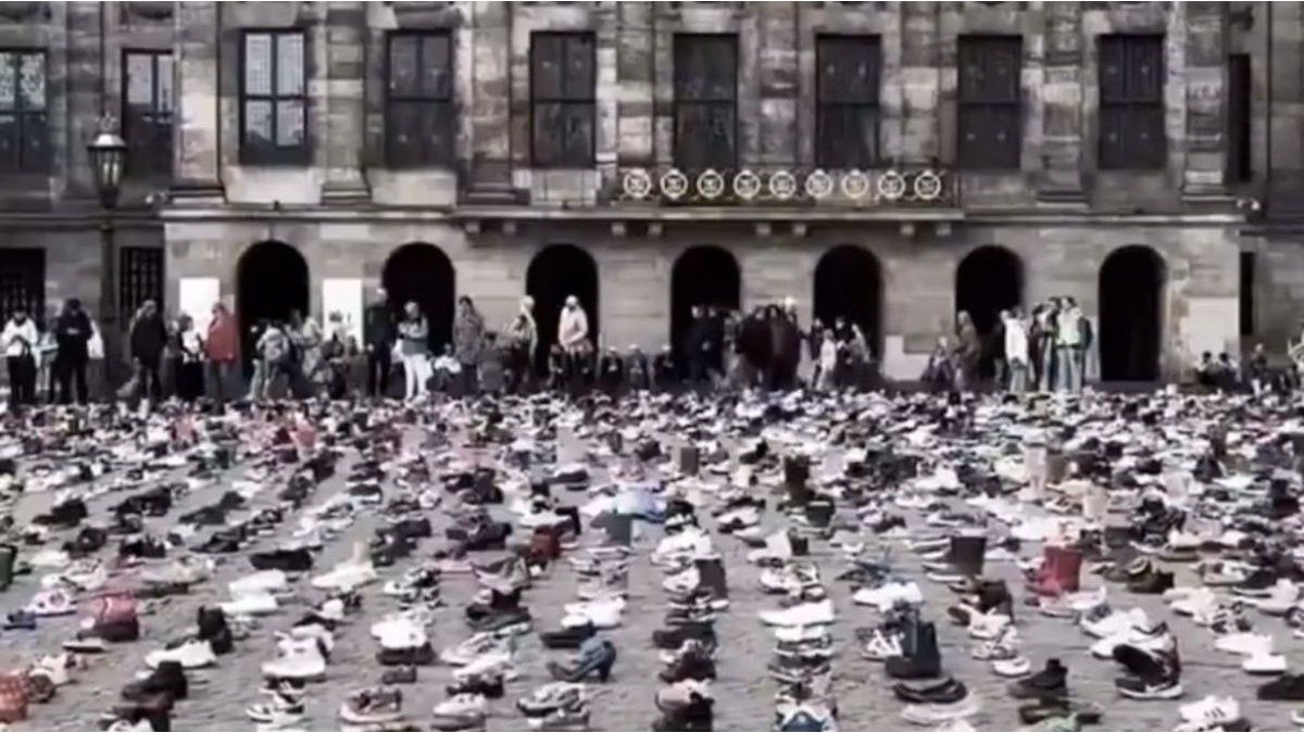 La manifestación denunció la muerte de más de 20.000 menores dejando 15.000 pares de zapatos en Plaza de Dam. Se exigió medidas contra Israel por incumplir el protocolo de asistencia tras el alto ...